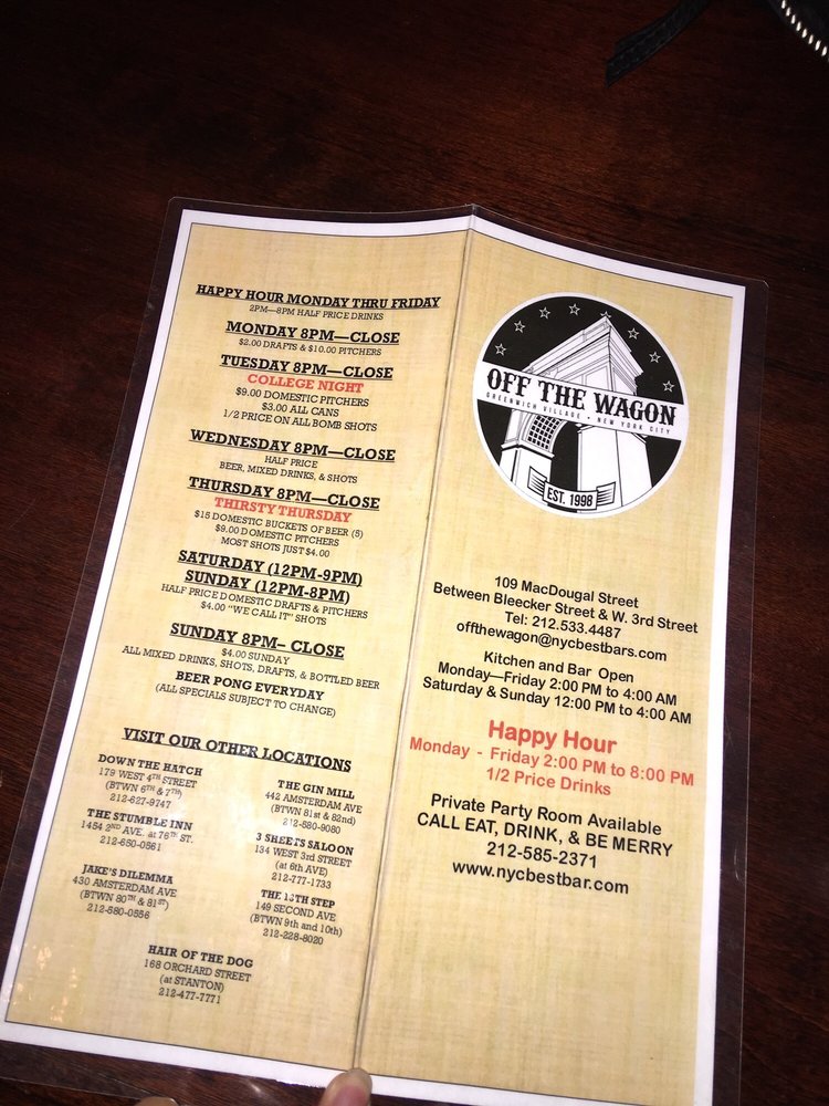 Welcome to Off The Wagon, a lively American eatery nestled on MacDougal Street in New York's iconic Village. This dive bar offers a casual atmosphere, perfect for groups seeking a fun outing. With an enticing menu featuring a variety of vegetarian options and renowned bar bites, such as their flavorful wings, there's something for everyone.